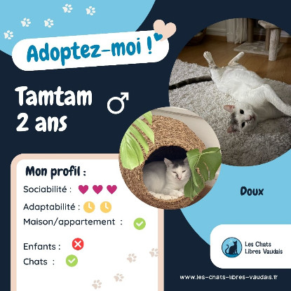 Tamtam est un super chat, tellement gentil. Doux comme un agneau, Tamtam ne ferait pas de mal à une mouche. Il est joueur, câlin, sage comme une image. Gourmand également, Tamtam ne refuse jamais une friandise ! Tamtam a sa façon à lui d’exprimer son amour, il développe une relation forte avec un ou deux humains. Ce chat est une merveille, il rendra très heureux ses humains avec sa tendresse.