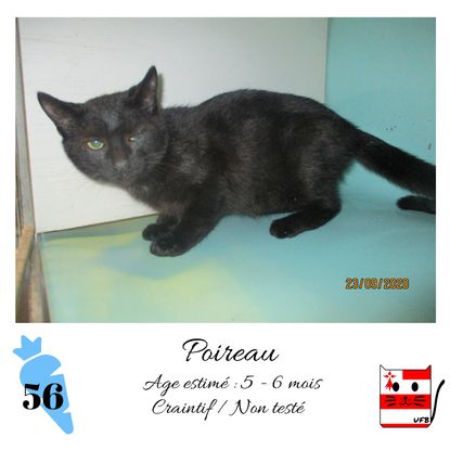 URGENCE EUTHANASIE ! Poireau est un mâle de 5-6 mois craintif (un comportement normal en fourrière) qui vous attend dans une fourrière du 56. ATTENTION SORTIE AU PLUS TARD LE 2/10/2020 (avant euthanasie) ! Pour adopter, c'est facile : ➡️ On se rend sur la page facebook d'Urgence Fourrière de Bretagne (UFB) -> https://www.facebook.com/sosfourrieresbreizh/ ➡️ On vient en message privé sur la page UFB ➡️ On remplit le questionnaire ➡️ Si le questionnaire est validé, on se rend disponible pour la pré-visite ➡️ On se rend aussi disponible pour venir chercher le loulou en fourrière Les chats sortent de fourrière primo-vaccinés et identifiés. Restera à charge de l’adoptant le rappel de vaccin et la stérilisation qui est OBLIGATOIRE. Les femelles en fourrière ayant été trouvées dans la rue, il y a fort à parier que nombre d'entre elles en âge de l'être soient gestantes ... ---- A PROPOS D'URGENCE FOURRIERE DE BRETAGNE (UFB) Nous sommes un COLLECTIF d'ASSOCIATIONS DE PROTECTION ANIMALE (qui rassemble notamment Moustaches et Compagnie, Bêtes de Scène, les Pachas, Chats Libres de Berné, etc, etc....) Le BUT de ce collectif d'associations est donc de SORTIR ces animaux des fourrières surchargées en les faisant ADOPTER de manière LEGALE par des familles ou en leur trouvant des FAMILLES D'ACCUEIL lorsque des places en association se libèrent.