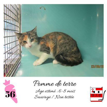 URGENCE EUTHANASIE ! Pomme de Terre est une femelle de 6-8 mois sauvageonne (un comportement normal en fourrière) qui vous attend dans une fourrière du 56. ATTENTION SORTIE AU PLUS TARD LE 2/10/2020 (avant euthanasie) ! Pour adopter, c'est facile : ➡️ On se rend sur la page facebook d'Urgence Fourrière de Bretagne (UFB) -> https://www.facebook.com/sosfourrieresbreizh/ ➡️ On vient en message privé sur la page UFB ➡️ On remplit le questionnaire ➡️ Si le questionnaire est validé, on se rend disponible pour la pré-visite ➡️ On se rend aussi disponible pour venir chercher le loulou en fourrière Les chats sortent de fourrière primo-vaccinés et identifiés. Restera à charge de l’adoptant le rappel de vaccin et la stérilisation qui est OBLIGATOIRE. Les femelles en fourrière ayant été trouvées dans la rue, il y a fort à parier que nombre d'entre elles en âge de l'être soient gestantes ... ---- A PROPOS D'URGENCE FOURRIERE DE BRETAGNE (UFB) Nous sommes un COLLECTIF d'ASSOCIATIONS DE PROTECTION ANIMALE (qui rassemble notamment Moustaches et Compagnie, Bêtes de Scène, les Pachas, Chats Libres de Berné, etc, etc....) Le BUT de ce collectif d'associations est donc de SORTIR ces animaux des fourrières surchargées en les faisant ADOPTER de manière LEGALE par des familles ou en leur trouvant des FAMILLES D'ACCUEIL lorsque des places en association se libèrent.
