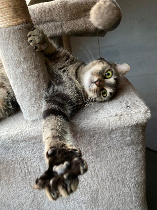 Je vais très bien ! Je suis propre, en pleine forme, et je mange avec appétit. Il me manque juste un bout d’oreille, sans doute suite à un accident passé. Cela ne me gêne absolument pas, c’est uniquement esthétique. Je suis une petite battante, pleine de vie et en bonne santé.