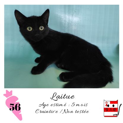 URGENCE EUTHANASIE ! Laitue est une femelle de 5 mois craintive (un comportement normal en fourrière) qui vous attend dans une fourrière du 56. ATTENTION SORTIE AU PLUS TARD LE 2/10/2020 (avant euthanasie) ! Pour adopter, c'est facile : ➡️ On se rend sur la page facebook d'Urgence Fourrière de Bretagne (UFB) -> https://www.facebook.com/sosfourrieresbreizh/ ➡️ On vient en message privé sur la page UFB ➡️ On remplit le questionnaire ➡️ Si le questionnaire est validé, on se rend disponible pour la pré-visite ➡️ On se rend aussi disponible pour venir chercher le loulou en fourrière Les chats sortent de fourrière primo-vaccinés et identifiés. Restera à charge de l’adoptant le rappel de vaccin et la stérilisation qui est OBLIGATOIRE. Les femelles en fourrière ayant été trouvées dans la rue, il y a fort à parier que nombre d'entre elles en âge de l'être soient gestantes ... ---- A PROPOS D'URGENCE FOURRIERE DE BRETAGNE (UFB) Nous sommes un COLLECTIF d'ASSOCIATIONS DE PROTECTION ANIMALE (qui rassemble notamment Moustaches et Compagnie, Bêtes de Scène, les Pachas, Chats Libres de Berné, etc, etc....) Le BUT de ce collectif d'associations est donc de SORTIR ces animaux des fourrières surchargées en les faisant ADOPTER de manière LEGALE par des familles ou en leur trouvant des FAMILLES D'ACCUEIL lorsque des places en association se libèrent.
