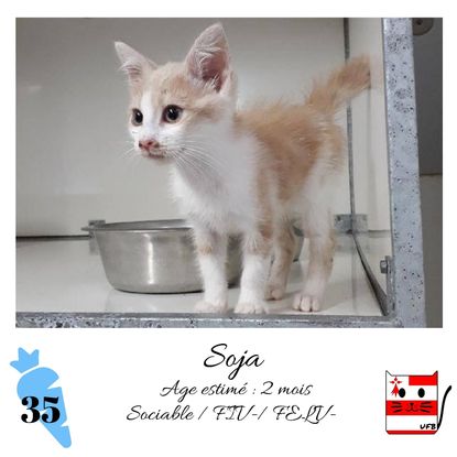 URGENCE EUTHANASIE ! Soja est un mâle de 2 mois sociable qui vous attend dans une fourrière du 35. ATTENTION SORTIE AU PLUS TARD LE 2/10/2020 (avant euthanasie) ! Pour adopter, c'est facile : ➡️ On se rend sur la page facebook d'Urgence Fourrière de Bretagne (UFB) -> https://www.facebook.com/sosfourrieresbreizh/ ➡️ On vient en message privé sur la page UFB ➡️ On remplit le questionnaire ➡️ Si le questionnaire est validé, on se rend disponible pour la pré-visite ➡️ On se rend aussi disponible pour venir chercher le loulou en fourrière Les chats sortent de fourrière primo-vaccinés et identifiés. Restera à charge de l’adoptant le rappel de vaccin et la stérilisation qui est OBLIGATOIRE. Les femelles en fourrière ayant été trouvées dans la rue, il y a fort à parier que nombre d'entre elles en âge de l'être soient gestantes ... ---- A PROPOS D'URGENCE FOURRIERE DE BRETAGNE (UFB) Nous sommes un COLLECTIF d'ASSOCIATIONS DE PROTECTION ANIMALE (qui rassemble notamment Moustaches et Compagnie, Bêtes de Scène, les Pachas, Chats Libres de Berné, etc, etc....) Le BUT de ce collectif d'associations est donc de SORTIR ces animaux des fourrières surchargées en les faisant ADOPTER de manière LEGALE par des familles ou en leur trouvant des FAMILLES D'ACCUEIL lorsque des places en association se libèrent.