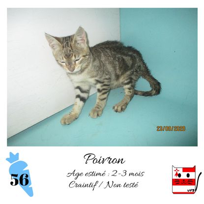 URGENCE EUTHANASIE ! Poivron est un mâle de 2-3 mois craintif (un comportement normal en fourrière) qui vous attend dans une fourrière du 56. ATTENTION SORTIE AU PLUS TARD LE 2/10/2020 (avant euthanasie) ! Pour adopter, c'est facile : ➡️ On se rend sur la page facebook d'Urgence Fourrière de Bretagne (UFB) -> https://www.facebook.com/sosfourrieresbreizh/ ➡️ On vient en message privé sur la page UFB ➡️ On remplit le questionnaire ➡️ Si le questionnaire est validé, on se rend disponible pour la pré-visite ➡️ On se rend aussi disponible pour venir chercher le loulou en fourrière Les chats sortent de fourrière primo-vaccinés et identifiés. Restera à charge de l’adoptant le rappel de vaccin et la stérilisation qui est OBLIGATOIRE. Les femelles en fourrière ayant été trouvées dans la rue, il y a fort à parier que nombre d'entre elles en âge de l'être soient gestantes ... ---- A PROPOS D'URGENCE FOURRIERE DE BRETAGNE (UFB) Nous sommes un COLLECTIF d'ASSOCIATIONS DE PROTECTION ANIMALE (qui rassemble notamment Moustaches et Compagnie, Bêtes de Scène, les Pachas, Chats Libres de Berné, etc, etc....) Le BUT de ce collectif d'associations est donc de SORTIR ces animaux des fourrières surchargées en les faisant ADOPTER de manière LEGALE par des familles ou en leur trouvant des FAMILLES D'ACCUEIL lorsque des places en association se libèrent.
