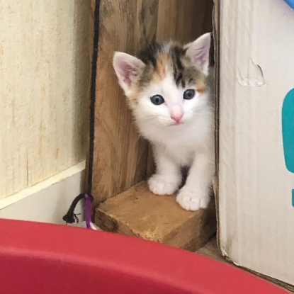 Elle est un plutôt à l’aise avec les humains et se laisse caresser. Elle aime aussi beaucoup jouer avec ses frères et soeurs.