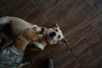 Elle est plus intéressée par les câlins avec les soigneurs du refuge que par jouer avec les autres chiens.