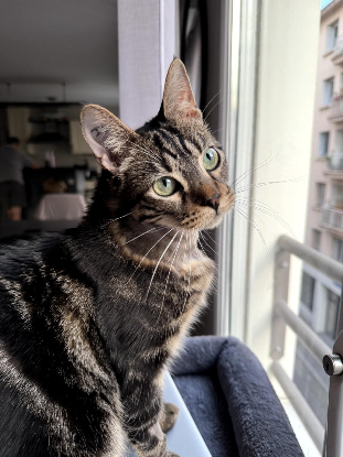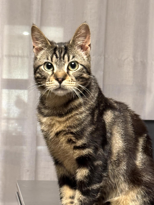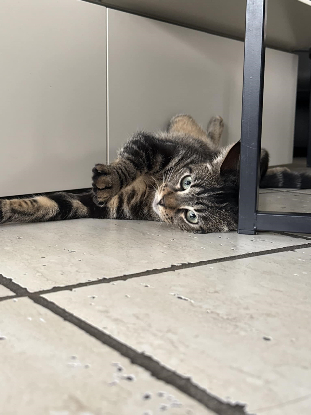 Il est très curieux et nous suit partout. Il vous piquera tous vos stylos pour jouer avec pendant des heures et vous ramènera la balle. Il adore regarder par la fenêtre et il adore les autres chats. C’est une boule d’amour qui fait craquer tout le monde.