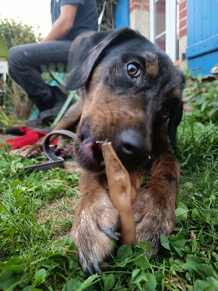 Avec ses congénères : Azu s’entend bien avec les autres chiens, mais son enthousiasme et sa fougue nécessitent un compagnon canin bien codé, tolérant et prêt à être (très) souvent sollicité.