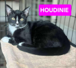 Véritable reine de la cachette à son arrivée, Houdinie savait disparaître à la moindre occasion (d'où son nom). Aujourd’hui, elle a beaucoup progressé : elle ose venir chercher les friandises, se laisse approcher et caresser de plus en plus facilement et montre toute sa personnalité. Gourmande, curieuse, joueuse… et cheffe incontestée de son frère qu’elle mène d’une patte assurée.