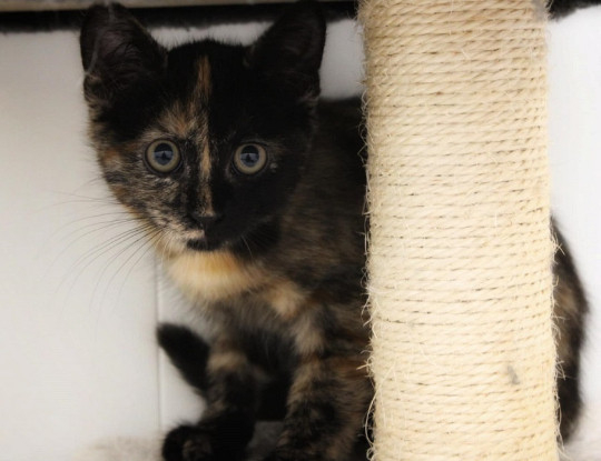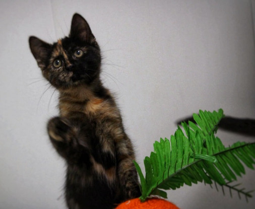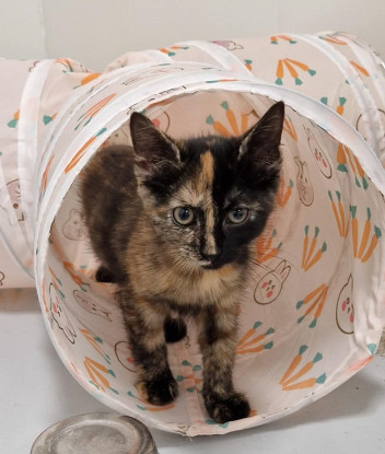 Nébula est une chatonne écaille de tortue née le 01/06/2025, issue d’une portée de 3 petits trouvés errants sur l’un de nos sites de nourrissage avec leur maman non sociable qui a été stérilisée. Malades du coryza à leur prise en charge, c’était la moins atteinte et elle a donc moins lutté pour survivre dehors.