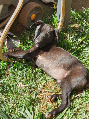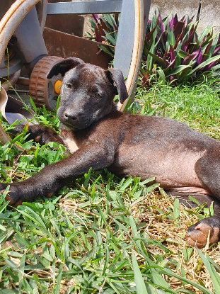 Son histoire : STELLA a été trouvée dans un champ de cannes avec ses 5 frères et sœurs. Déposé avec seulement une gamelle de riz et de l'eau, elle et sa sœur se sont bien caché et la fratrie à été sauvée, sans elles !
