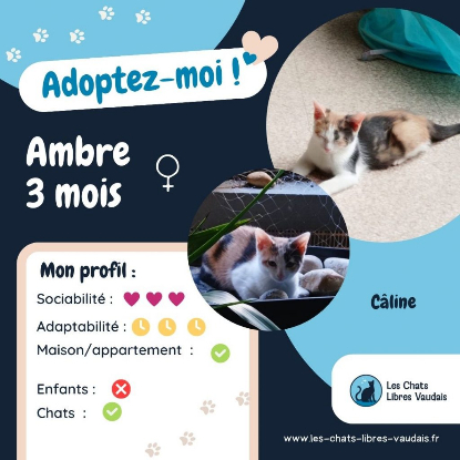 La petite Ambre est extrêmement craquante. Cette choupette de 3 mois fait fondre tous les humains qui la rencontrent. Discrète de caractère, Ambre est une jeune minette très proche de son humaine, câline et aussi une machine à ronron. Ambre aime aussi beaucoup jouer avec ses frères et soeurs, et ne rate jamais le moment de gourmandise de la journée ! Ambre est une bonne vivante, débordante de vie et d’amour.