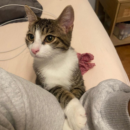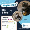 Ray a environ 5 mois. Comme tout chaton de son âge qui se respecte, Ray est un petit soleil toujours de bonne humeur ! Il aime beaucoup jouer : petite balle, souris en plastique, mouche volante.. Tout y passe, car Ray est très rusé et curieux. Ray adore aussi les câlins, les longues siestes sur le canapé et le lit. C’est un chaton vraiment adorable, qui a hâte de trouver sa famille pour la vie !