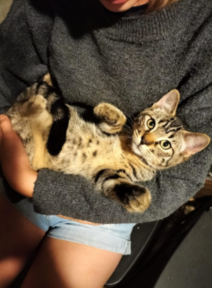 Je suis de nature gourmande. J'adore jouer avec toute sortes de jouets qui roulent et font du bruit. Je suis très câlin et je ronronne beaucoup. J'adore me blottir contre les humains et profiter des caresses. Je suis assez actif le matin et en fin d’après midi.