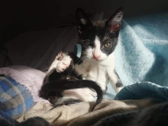 Radis est un mâle noir et blanc d'environ 4 mois. Radis est un chaton dynamique et affectueux. Retrouvé seul très jeune, il n'a pas bénéficié d'un sevrage complet et cherche donc impérativement une famille avec un autre chat sociable prêt à lui apprendre les bons réflexes félins et aussi des adoptants compréhensifs. Il est très dynamique mais son début de vie difficile lui a prit un de ses deux yeux. Radis ne pourra donc pas avoir accès à l'extérieur, trop dangereux pour lui, et ce, pour toute sa vie. Il a reçu plusieurs soins vétérinaires : → identification par une puce électronique → vaccination contre le typhus et le coryza (primo-vaccination) Sa stérilisation est obligatoire à 6 mois. Il est adoptable contre une participation aux frais vétérinaires.