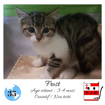 URGENCE EUTHANASIE ! Frost est un mâle de 3-4 mois craintif (un comportement normal en fourrière) qui vous attend dans une fourrière du 35. ATTENTION SORTIE AU PLUS TARD LE 9/10/2020 (avant euthanasie) ! Pour adopter, c'est facile : ➡️ On se rend sur la page facebook d'Urgence Fourrière de Bretagne (UFB) -> https://www.facebook.com/sosfourrieresbreizh/ ➡️ On vient en message privé sur la page UFB ➡️ On remplit le questionnaire ➡️ Si le questionnaire est validé, on se rend disponible pour la pré-visite ➡️ On se rend aussi disponible pour venir chercher le loulou en fourrière Les chats sortent de fourrière primo-vaccinés et identifiés. Restera à charge de l’adoptant le rappel de vaccin et la stérilisation qui est OBLIGATOIRE. Les femelles en fourrière ayant été trouvées dans la rue, il y a fort à parier que nombre d'entre elles en âge de l'être soient gestantes ... ---- A PROPOS D'URGENCE FOURRIERE DE BRETAGNE (UFB) Nous sommes un COLLECTIF d'ASSOCIATIONS DE PROTECTION ANIMALE (qui rassemble notamment Moustaches et Compagnie, Bêtes de Scène, les Pachas, Chats Libres de Berné, etc, etc....) Le BUT de ce collectif d'associations est donc de SORTIR ces animaux des fourrières surchargées en les faisant ADOPTER de manière LEGALE par des familles ou en leur trouvant des FAMILLES D'ACCUEIL lorsque des places en association se libèrent.