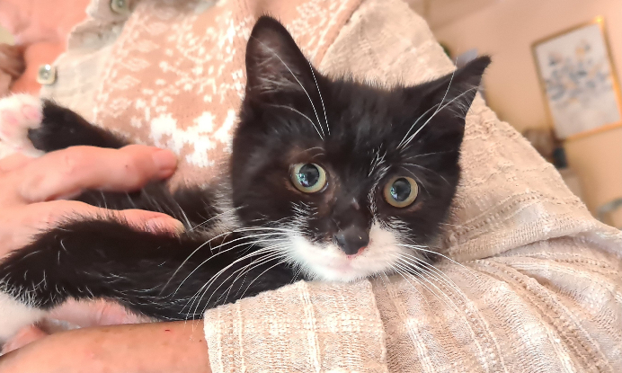 Grâce à la patience de sa famille d'accueil, il s'est détendu et a compris que l'humain est là pour son bien-être et pour lui apporter de l'affection. Il est de plus en plus à l'aise et apprécie les caresses. Pour l'instant c'est un chaton assez calme.
