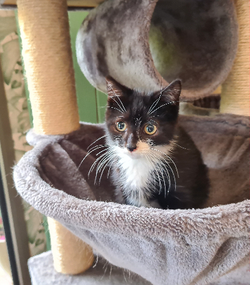 Grâce à la patience de sa famille d'accueil, il s'est détendu et a compris que l'humain est là pour son bien-être et pour lui apporter de l'affection. Il est de plus en plus à l'aise et apprécie les caresses. Pour l'instant c'est un chaton assez calme.