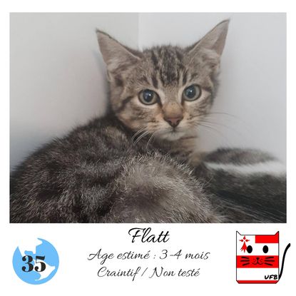 URGENCE EUTHANASIE ! Flatt est un mâle de 3-4 mois craintif (un comportement normal en fourrière) qui vous attend dans une fourrière du 35. ATTENTION SORTIE AU PLUS TARD LE 9/10/2020 (avant euthanasie) ! Pour adopter, c'est facile : ➡️ On se rend sur la page facebook d'Urgence Fourrière de Bretagne (UFB) -> https://www.facebook.com/sosfourrieresbreizh/ ➡️ On vient en message privé sur la page UFB ➡️ On remplit le questionnaire ➡️ Si le questionnaire est validé, on se rend disponible pour la pré-visite ➡️ On se rend aussi disponible pour venir chercher le loulou en fourrière Les chats sortent de fourrière primo-vaccinés et identifiés. Restera à charge de l’adoptant le rappel de vaccin et la stérilisation qui est OBLIGATOIRE. Les femelles en fourrière ayant été trouvées dans la rue, il y a fort à parier que nombre d'entre elles en âge de l'être soient gestantes ... ---- A PROPOS D'URGENCE FOURRIERE DE BRETAGNE (UFB) Nous sommes un COLLECTIF d'ASSOCIATIONS DE PROTECTION ANIMALE (qui rassemble notamment Moustaches et Compagnie, Bêtes de Scène, les Pachas, Chats Libres de Berné, etc, etc....) Le BUT de ce collectif d'associations est donc de SORTIR ces animaux des fourrières surchargées en les faisant ADOPTER de manière LEGALE par des familles ou en leur trouvant des FAMILLES D'ACCUEIL lorsque des places en association se libèrent.