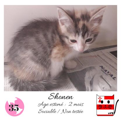 URGENCE EUTHANASIE ! Shonen est une femelle de 2 mois sociable qui vous attend dans une fourrière du 35. ATTENTION SORTIE AU PLUS TARD LE 9/10/2020 (avant euthanasie) ! Pour adopter, c'est facile : ➡️ On se rend sur la page facebook d'Urgence Fourrière de Bretagne (UFB) -> https://www.facebook.com/sosfourrieresbreizh/ ➡️ On vient en message privé sur la page UFB ➡️ On remplit le questionnaire ➡️ Si le questionnaire est validé, on se rend disponible pour la pré-visite ➡️ On se rend aussi disponible pour venir chercher le loulou en fourrière Les chats sortent de fourrière primo-vaccinés et identifiés. Restera à charge de l’adoptant le rappel de vaccin et la stérilisation qui est OBLIGATOIRE. Les femelles en fourrière ayant été trouvées dans la rue, il y a fort à parier que nombre d'entre elles en âge de l'être soient gestantes ... ---- A PROPOS D'URGENCE FOURRIERE DE BRETAGNE (UFB) Nous sommes un COLLECTIF d'ASSOCIATIONS DE PROTECTION ANIMALE (qui rassemble notamment Moustaches et Compagnie, Bêtes de Scène, les Pachas, Chats Libres de Berné, etc, etc....) Le BUT de ce collectif d'associations est donc de SORTIR ces animaux des fourrières surchargées en les faisant ADOPTER de manière LEGALE par des familles ou en leur trouvant des FAMILLES D'ACCUEIL lorsque des places en association se libèrent.