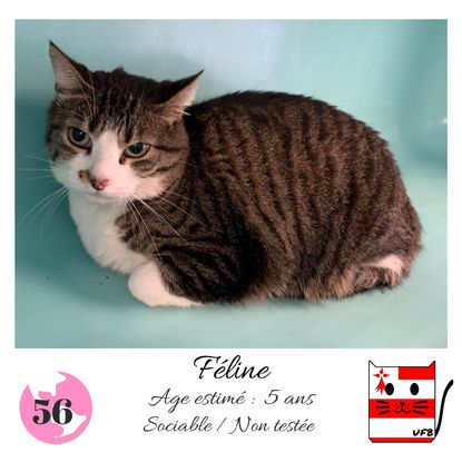 URGENCE EUTHANASIE ! Féline est une femelle de 5 ans sociable qui vous attend dans une fourrière du 56. ATTENTION SORTIE AU PLUS TARD LE 9/10/2020 (avant euthanasie) ! Pour adopter, c'est facile : ➡️ On se rend sur la page facebook d'Urgence Fourrière de Bretagne (UFB) -> https://www.facebook.com/sosfourrieresbreizh/ ➡️ On vient en message privé sur la page UFB ➡️ On remplit le questionnaire ➡️ Si le questionnaire est validé, on se rend disponible pour la pré-visite ➡️ On se rend aussi disponible pour venir chercher le loulou en fourrière Les chats sortent de fourrière primo-vaccinés et identifiés. Restera à charge de l’adoptant le rappel de vaccin et la stérilisation qui est OBLIGATOIRE. Les femelles en fourrière ayant été trouvées dans la rue, il y a fort à parier que nombre d'entre elles en âge de l'être soient gestantes ... ---- A PROPOS D'URGENCE FOURRIERE DE BRETAGNE (UFB) Nous sommes un COLLECTIF d'ASSOCIATIONS DE PROTECTION ANIMALE (qui rassemble notamment Moustaches et Compagnie, Bêtes de Scène, les Pachas, Chats Libres de Berné, etc, etc....) Le BUT de ce collectif d'associations est donc de SORTIR ces animaux des fourrières surchargées en les faisant ADOPTER de manière LEGALE par des familles ou en leur trouvant des FAMILLES D'ACCUEIL lorsque des places en association se libèrent.