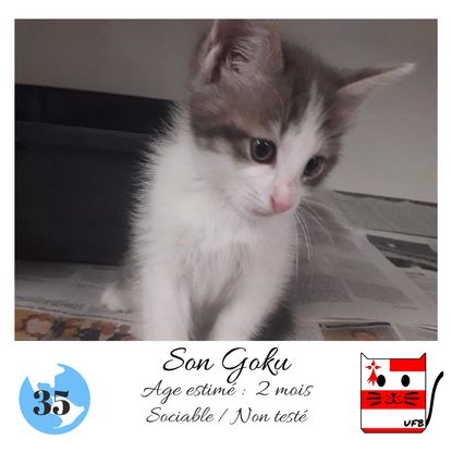 URGENCE EUTHANASIE ! Son Goku est un mâle de 2 mois sociable qui vous attend dans une fourrière du 35. ATTENTION SORTIE AU PLUS TARD LE 9/10/2020 (avant euthanasie) ! Pour adopter, c'est facile : ➡️ On se rend sur la page facebook d'Urgence Fourrière de Bretagne (UFB) -> https://www.facebook.com/sosfourrieresbreizh/ ➡️ On vient en message privé sur la page UFB ➡️ On remplit le questionnaire ➡️ Si le questionnaire est validé, on se rend disponible pour la pré-visite ➡️ On se rend aussi disponible pour venir chercher le loulou en fourrière Les chats sortent de fourrière primo-vaccinés et identifiés. Restera à charge de l’adoptant le rappel de vaccin et la stérilisation qui est OBLIGATOIRE. Les femelles en fourrière ayant été trouvées dans la rue, il y a fort à parier que nombre d'entre elles en âge de l'être soient gestantes ... ---- A PROPOS D'URGENCE FOURRIERE DE BRETAGNE (UFB) Nous sommes un COLLECTIF d'ASSOCIATIONS DE PROTECTION ANIMALE (qui rassemble notamment Moustaches et Compagnie, Bêtes de Scène, les Pachas, Chats Libres de Berné, etc, etc....) Le BUT de ce collectif d'associations est donc de SORTIR ces animaux des fourrières surchargées en les faisant ADOPTER de manière LEGALE par des familles ou en leur trouvant des FAMILLES D'ACCUEIL lorsque des places en association se libèrent.