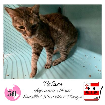 URGENCE EUTHANASIE ! Palace est une femelle de 14 ans sociable qui vous attend dans une fourrière du 56. ATTENTION SORTIE AU PLUS TARD LE 9/10/2020 (avant euthanasie) ! Pour adopter, c'est facile : ➡️ On se rend sur la page facebook d'Urgence Fourrière de Bretagne (UFB) -> https://www.facebook.com/sosfourrieresbreizh/ ➡️ On vient en message privé sur la page UFB ➡️ On remplit le questionnaire ➡️ Si le questionnaire est validé, on se rend disponible pour la pré-visite ➡️ On se rend aussi disponible pour venir chercher le loulou en fourrière Les chats sortent de fourrière primo-vaccinés et identifiés. Restera à charge de l’adoptant le rappel de vaccin et la stérilisation qui est OBLIGATOIRE. Les femelles en fourrière ayant été trouvées dans la rue, il y a fort à parier que nombre d'entre elles en âge de l'être soient gestantes ... ---- A PROPOS D'URGENCE FOURRIERE DE BRETAGNE (UFB) Nous sommes un COLLECTIF d'ASSOCIATIONS DE PROTECTION ANIMALE (qui rassemble notamment Moustaches et Compagnie, Bêtes de Scène, les Pachas, Chats Libres de Berné, etc, etc....) Le BUT de ce collectif d'associations est donc de SORTIR ces animaux des fourrières surchargées en les faisant ADOPTER de manière LEGALE par des familles ou en leur trouvant des FAMILLES D'ACCUEIL lorsque des places en association se libèrent.