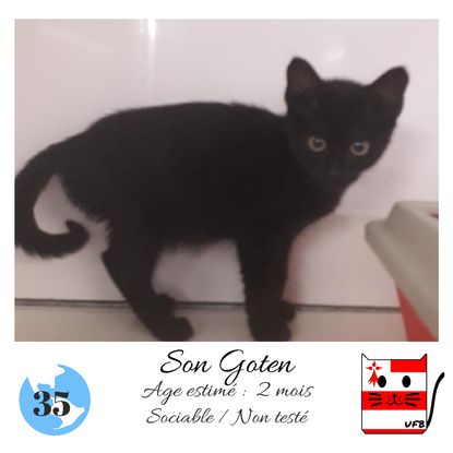 URGENCE EUTHANASIE ! Son Goten est un mâle de 2 mois sociable qui vous attend dans une fourrière du 35. ATTENTION SORTIE AU PLUS TARD LE 9/10/2020 (avant euthanasie) ! Pour adopter, c'est facile : ➡️ On se rend sur la page facebook d'Urgence Fourrière de Bretagne (UFB) -> https://www.facebook.com/sosfourrieresbreizh/ ➡️ On vient en message privé sur la page UFB ➡️ On remplit le questionnaire ➡️ Si le questionnaire est validé, on se rend disponible pour la pré-visite ➡️ On se rend aussi disponible pour venir chercher le loulou en fourrière Les chats sortent de fourrière primo-vaccinés et identifiés. Restera à charge de l’adoptant le rappel de vaccin et la stérilisation qui est OBLIGATOIRE. Les femelles en fourrière ayant été trouvées dans la rue, il y a fort à parier que nombre d'entre elles en âge de l'être soient gestantes ... ---- A PROPOS D'URGENCE FOURRIERE DE BRETAGNE (UFB) Nous sommes un COLLECTIF d'ASSOCIATIONS DE PROTECTION ANIMALE (qui rassemble notamment Moustaches et Compagnie, Bêtes de Scène, les Pachas, Chats Libres de Berné, etc, etc....) Le BUT de ce collectif d'associations est donc de SORTIR ces animaux des fourrières surchargées en les faisant ADOPTER de manière LEGALE par des familles ou en leur trouvant des FAMILLES D'ACCUEIL lorsque des places en association se libèrent.