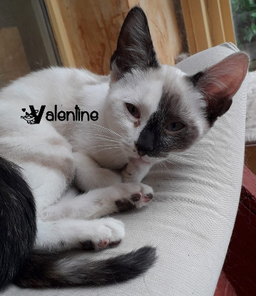 VALENTINE est identifiée, déparasitée, vermifugée, primo-vaccinée et testée négative aux maladies FIV et FELV.