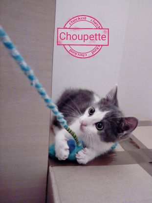 Choupette, 2 mois, encore un poil craintive quand elle ne connait pas. Identifiée, vaccinée (première injection typhus coryza et leucose) et déparasitée. A stériliser avant 6 mois (obligatoire et contractuel, compris dans les frais d'adoption). Frais d'adoption de 150 euros (180 euros si seconde injection vaccinale faite).