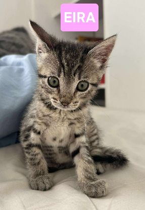 Eira a été recueillie toute petite, seule dans la rue à seulement 4 semaines. Biberonnée et choyée, elle est devenue une magnifique minette au regard unique, comme souligné d’eyeliner.