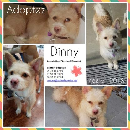 sauvée, avec sa maman, d'une fourrière mouroir en Chine, lorsqu'elle était chiot. Dinny est arrivée en famille d'accueil le 05 septembre 2020. Au début, peureuse, fuyante, elle s'est ouverte et se montre affectueuse, demandeuse d'attention et douce. C'est une chienne discrète, calme et sage. Elle aime observer. Elle a encore peur du conjoint de la famille d'accueil mais s'approche avec plaisir pour recevoir de la nourriture. Elle entre et sort dans le jardin sans problème. Elle est encore apeuré dans la rue et préfère revenir à la maison. Elle commence à faire des appels aux jeux à l'un des chiens de la famille d'accueil. Elle vivait avec une meute de chiens en Chine donc elle s'entend avec ses congénères. Elle a juste besoin de temps. Elle est ok chats. Dinny se laisse manipuler, elle a un regard très expressif qui fait comprendre quelle est apeurée mais elle fait confiance et finit par se détendre. Elle aura besoin d'une famille calme et patiente pour évoluer à son rythme.