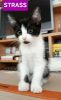 Jolie chatonne noire et blanche Strass est curieuse de tout. Elle explore son petit monde avec entrain, mais sait aussi apprécier les moments de tendresse. Strass est l'aventurière de la fraterie, elle part toujours en tête du peloton pour explorer chaque recoin, entraînant ses frères et sœurs dans ses découvertes…