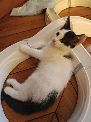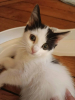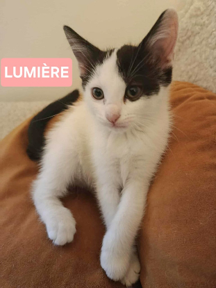 La coquine du groupe ! Lumière porte bien son nom car elle illumine la fratrie. Jolie chatonne blanche et noire, Lumière est la bonne humeur incarnée, toujours partante pour une partie de jeux avec ses soeurs, pour de l'exploration ou pour des pauses câlins. C'est une chatonne qui s'adapte facilement à son environnement et aux autres chats.