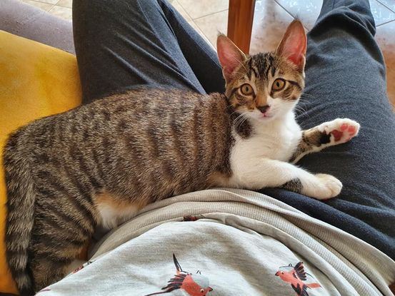 Chickillo est un mâle tabby et blanc d'environ 5 mois. Chickillo est un petit chaton joueur et aventurier qui aime bien découvrir de nouvelles choses ! Il est une petite boîte à ronrons sur pattes avec les humains mais aussi avec les autres chats qu'il adore ! Chickillo aura besoin de vivre avec un autre chat pour s'épanouir pleinement. Il a reçu plusieurs soins vétérinaires : → identification par une puce électronique → vaccination contre le typhus et le coryza Sa stérilisation est obligatoire à 6 mois. Il est adoptable contre une participation aux frais vétérinaires