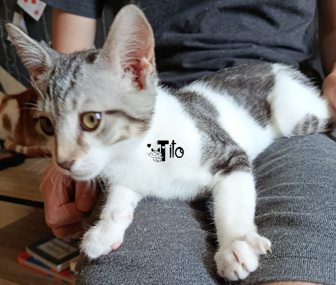 Tito est identifié, déparasité, vermifugé, primo-vacciné et testé négatif aux maladies FIV et FELV.