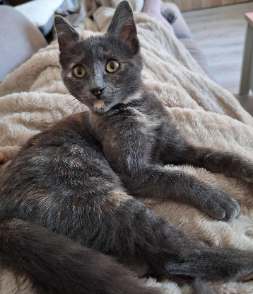 Je suis une chatonne de couleur écaille de tortue diluée.