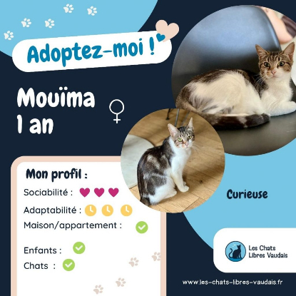 Nous vous présentons la belle Mouïma ! Jeune minette pleine de vie, bien dans ses pattounes. Mouïma sait ce qu’elle veut et est très communicative : un regard pour des friandises, un autre regard pour des câlins, et encore un regard différent pour du jeu. Mouïma adore les humains, c’est un chat pot de colle, qui déborde d’amour. De l’amour, elle en a à revendre ! Pour des câlins, des séances de ronron le matin & le soir. Mouïma c’est une minette qui profite enfin de la vie, et surtout exprime de façon inconditionnelle sa reconnaissance envers ses humains.