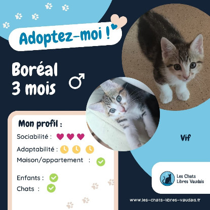 Boréal, c’est un concentré puissant d’amour et de joie. Petit bonhomme déjà très sociable, bien dans ses pattounes, curieux et intrépide. Boréal a de l’énergie a dépensé pour jouer, courir, sauter, mais surtout vous faire rire. Ce petit rigolo a beaucoup de charme et d’amour à offrir. Les moments de sieste se font très souvent sur son humaine. Voilà un petit bout de choux à découvrir et chadopter !
