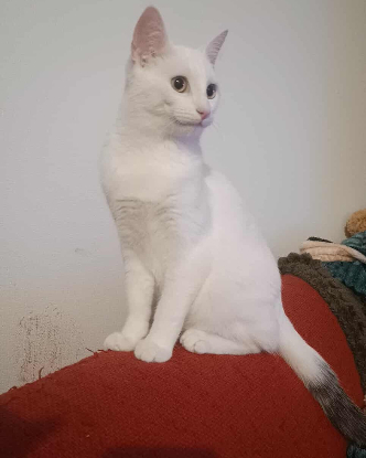Diabolo est un beau chaton blanc de bientôt 6 mois ! Il est très câlin et aime profiter de son humain en montant sur ses genoux et en réclamant des caresses.