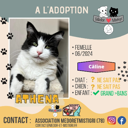 ? Athéna partira stérilisée, identifiée, vaccinée (typhus coryza), déparasitée, testée Fiv et FelV négatif.