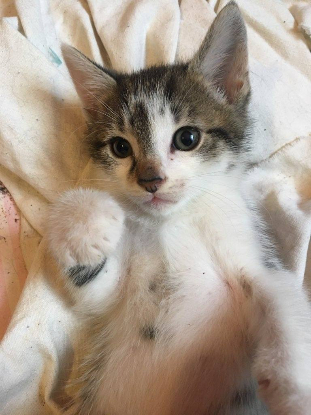 Mon pelage gris tigré et blanc et ma tâche sur le nez et mon oreille blanche sont mes marques de fabrique !