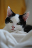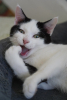 J-C est très câlin : il dort collé aux humains ou blotti sous la couette, aime les genoux et se laisse porter dans les bras le temps d'un bisou.