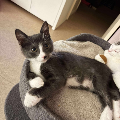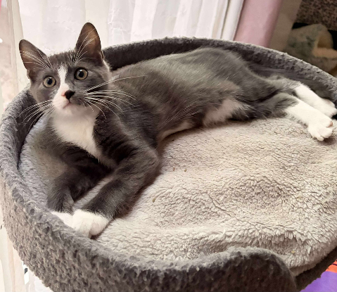 Cette petite chipie grise aux chaussettes blanches et sa bouille craquante est une vraie boule d’énergie et de tendresse.