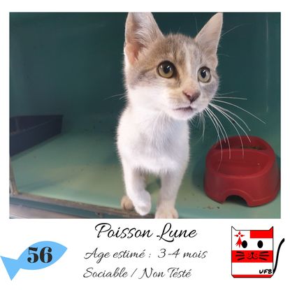 URGENCE EUTHANASIE ! Poisson Lune est un mâle de 3-4 mois sociable qui vous attend dans une fourrière du 56. ATTENTION SORTIE AU PLUS TARD LE 16/10/2020 (avant euthanasie) ! Pour adopter, c'est facile : ➡️ On se rend sur la page facebook d'Urgence Fourrière de Bretagne (UFB) -> https://www.facebook.com/sosfourrieresbreizh/ ➡️ On vient en message privé sur la page UFB ➡️ On remplit le questionnaire ➡️ Si le questionnaire est validé, on se rend disponible pour la pré-visite ➡️ On se rend aussi disponible pour venir chercher le loulou en fourrière Les chats sortent de fourrière primo-vaccinés et identifiés. Restera à charge de l’adoptant le rappel de vaccin et la stérilisation qui est OBLIGATOIRE. Les femelles en fourrière ayant été trouvées dans la rue, il y a fort à parier que nombre d'entre elles en âge de l'être soient gestantes ... ---- A PROPOS D'URGENCE FOURRIERE DE BRETAGNE (UFB) Nous sommes un COLLECTIF d'ASSOCIATIONS DE PROTECTION ANIMALE (qui rassemble notamment Moustaches et Compagnie, Bêtes de Scène, les Pachas, Chats Libres de Berné, etc, etc....) Le BUT de ce collectif d'associations est donc de SORTIR ces animaux des fourrières surchargées en les faisant ADOPTER de manière LEGALE par des familles ou en leur trouvant des FAMILLES D'ACCUEIL lorsque des places en association se libèrent.