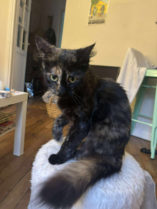 Nous vous présentons une adorable chatte à la robe écaille de tortue, au tempérament aussi doux que son pelage.