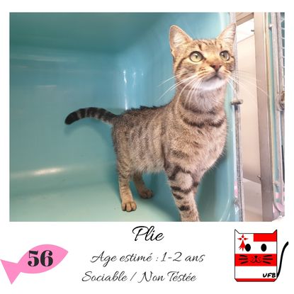 URGENCE EUTHANASIE ! Plie est une femelle de 1-2 ans sociable qui vous attend dans une fourrière du 56. ATTENTION SORTIE AU PLUS TARD LE 16/10/2020 (avant euthanasie) ! Pour adopter, c'est facile : ➡️ On se rend sur la page facebook d'Urgence Fourrière de Bretagne (UFB) -> https://www.facebook.com/sosfourrieresbreizh/ ➡️ On vient en message privé sur la page UFB ➡️ On remplit le questionnaire ➡️ Si le questionnaire est validé, on se rend disponible pour la pré-visite ➡️ On se rend aussi disponible pour venir chercher le loulou en fourrière Les chats sortent de fourrière primo-vaccinés et identifiés. Restera à charge de l’adoptant le rappel de vaccin et la stérilisation qui est OBLIGATOIRE. Les femelles en fourrière ayant été trouvées dans la rue, il y a fort à parier que nombre d'entre elles en âge de l'être soient gestantes ... ---- A PROPOS D'URGENCE FOURRIERE DE BRETAGNE (UFB) Nous sommes un COLLECTIF d'ASSOCIATIONS DE PROTECTION ANIMALE (qui rassemble notamment Moustaches et Compagnie, Bêtes de Scène, les Pachas, Chats Libres de Berné, etc, etc....) Le BUT de ce collectif d'associations est donc de SORTIR ces animaux des fourrières surchargées en les faisant ADOPTER de manière LEGALE par des familles ou en leur trouvant des FAMILLES D'ACCUEIL lorsque des places en association se libèrent.