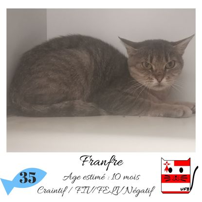 URGENCE EUTHANASIE ! Franfre est un mâle de 10 mois craintif (un comportement normal en fourrière) qui vous attend dans une fourrière du 35. ATTENTION SORTIE AU PLUS TARD LE 16/10/2020 (avant euthanasie) ! Pour adopter, c'est facile : ➡️ On se rend sur la page facebook d'Urgence Fourrière de Bretagne (UFB) -> https://www.facebook.com/sosfourrieresbreizh/ ➡️ On vient en message privé sur la page UFB ➡️ On remplit le questionnaire ➡️ Si le questionnaire est validé, on se rend disponible pour la pré-visite ➡️ On se rend aussi disponible pour venir chercher le loulou en fourrière Les chats sortent de fourrière primo-vaccinés et identifiés. Restera à charge de l’adoptant le rappel de vaccin et la stérilisation qui est OBLIGATOIRE. Les femelles en fourrière ayant été trouvées dans la rue, il y a fort à parier que nombre d'entre elles en âge de l'être soient gestantes ... ---- A PROPOS D'URGENCE FOURRIERE DE BRETAGNE (UFB) Nous sommes un COLLECTIF d'ASSOCIATIONS DE PROTECTION ANIMALE (qui rassemble notamment Moustaches et Compagnie, Bêtes de Scène, les Pachas, Chats Libres de Berné, etc, etc....) Le BUT de ce collectif d'associations est donc de SORTIR ces animaux des fourrières surchargées en les faisant ADOPTER de manière LEGALE par des familles ou en leur trouvant des FAMILLES D'ACCUEIL lorsque des places en association se libèrent.