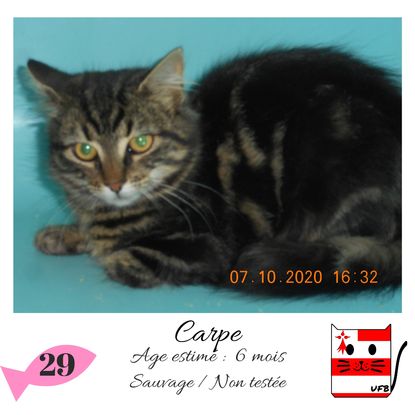URGENCE EUTHANASIE ! Carpe est une femelle de 6 mois sauvageonne (un comportement normal en fourrière) qui vous attend dans une fourrière du 29. ATTENTION SORTIE AU PLUS TARD LE 16/10/2020 (avant euthanasie) ! Pour adopter, c'est facile : ➡️ On se rend sur la page facebook d'Urgence Fourrière de Bretagne (UFB) -> https://www.facebook.com/sosfourrieresbreizh/ ➡️ On vient en message privé sur la page UFB ➡️ On remplit le questionnaire ➡️ Si le questionnaire est validé, on se rend disponible pour la pré-visite ➡️ On se rend aussi disponible pour venir chercher le loulou en fourrière Les chats sortent de fourrière primo-vaccinés et identifiés. Restera à charge de l’adoptant le rappel de vaccin et la stérilisation qui est OBLIGATOIRE. Les femelles en fourrière ayant été trouvées dans la rue, il y a fort à parier que nombre d'entre elles en âge de l'être soient gestantes ... ---- A PROPOS D'URGENCE FOURRIERE DE BRETAGNE (UFB) Nous sommes un COLLECTIF d'ASSOCIATIONS DE PROTECTION ANIMALE (qui rassemble notamment Moustaches et Compagnie, Bêtes de Scène, les Pachas, Chats Libres de Berné, etc, etc....) Le BUT de ce collectif d'associations est donc de SORTIR ces animaux des fourrières surchargées en les faisant ADOPTER de manière LEGALE par des familles ou en leur trouvant des FAMILLES D'ACCUEIL lorsque des places en association se libèrent.