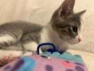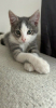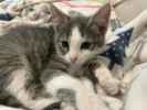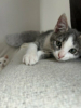 Plumette est une adorable chatonne de 4 mois, au pelage tigré gris et blanc aussi doux que son regard.