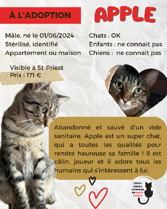 Abandonné et sauvé d’un vide sanitaire, Apple est un super chat, qui a toutes les qualités pour rendre heureuse sa famille ! Il est câlin, joueur et il adore tous les humains qui s’intéressent à lui.